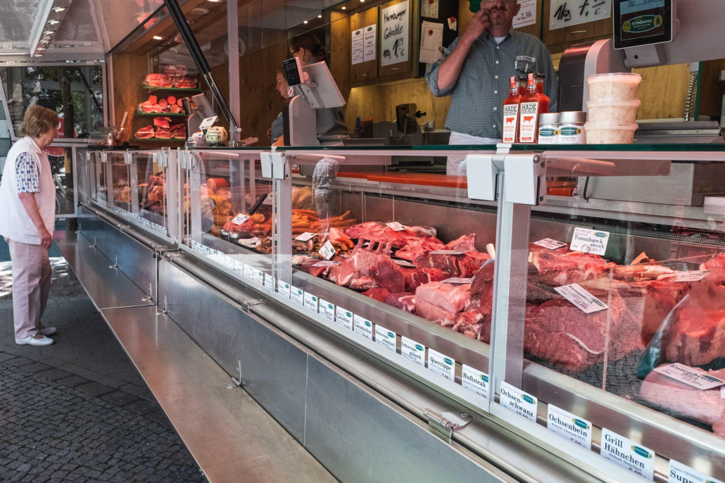 - 7,1 m Verkaufskühltheke, 740 mm Auslage mit senkrechtem Glasbeschlag