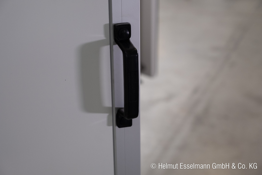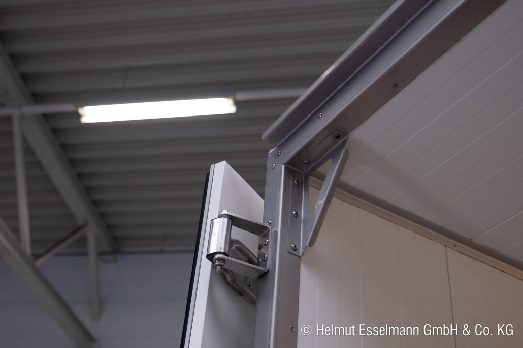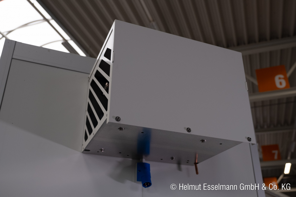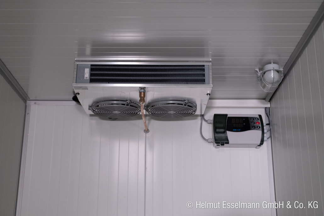 Kälteanlage SplittChill© mit elektrischer Abtauung und elektronischer Regelung in einem Kühlmaschinenkasten an der Stirnwand oben montiert.