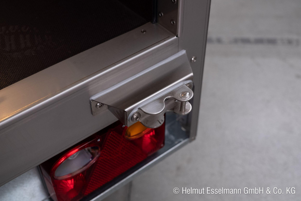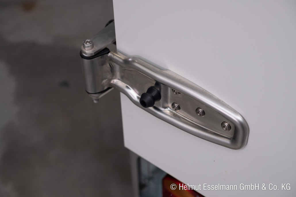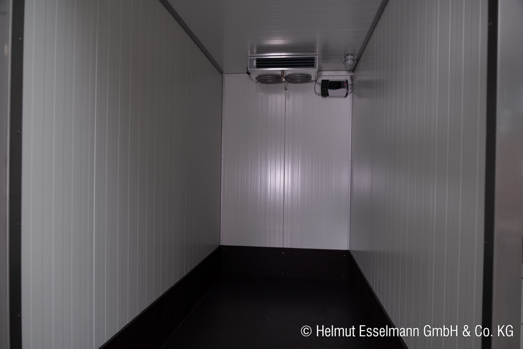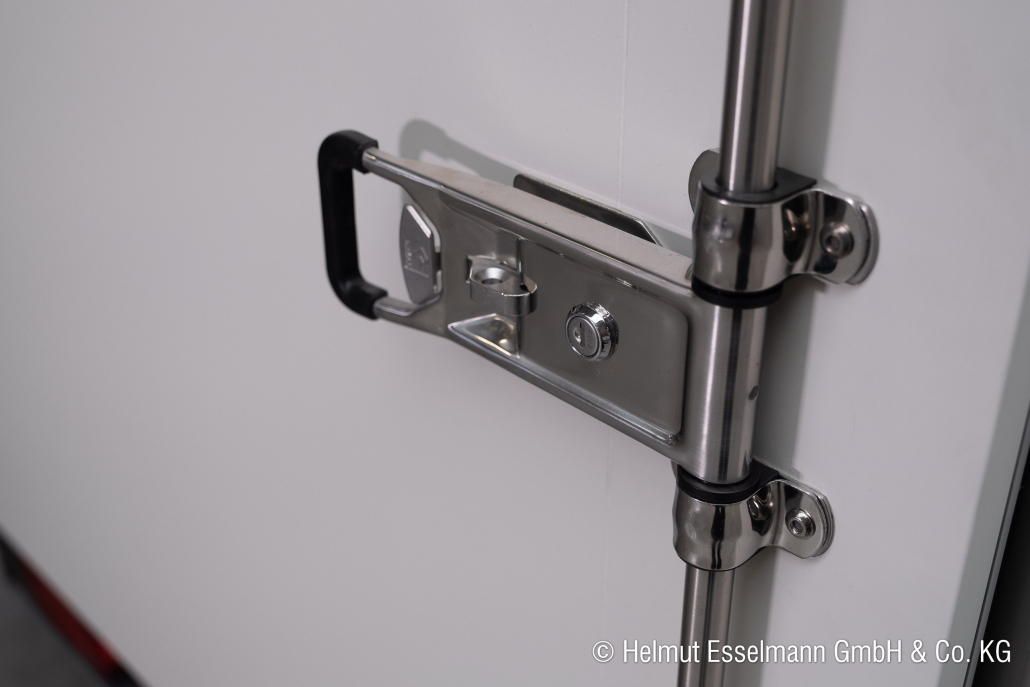 geschweißter, feuerverzinkter Tieflader-Fahrgestellrahmen, FePur© Kofferaufbau mit 60mm Isolierung, bündiges Edelstahlheckportal in verstärkter Ausführung, verstärkte Ladekante aus 2mm Edelstahl, eine Tür über die volle Ladebreite mit Drehstangenverschluss abschließbar und zusätzlicher Schließöse für ein Vorhängeschloss, Türfeststeller,