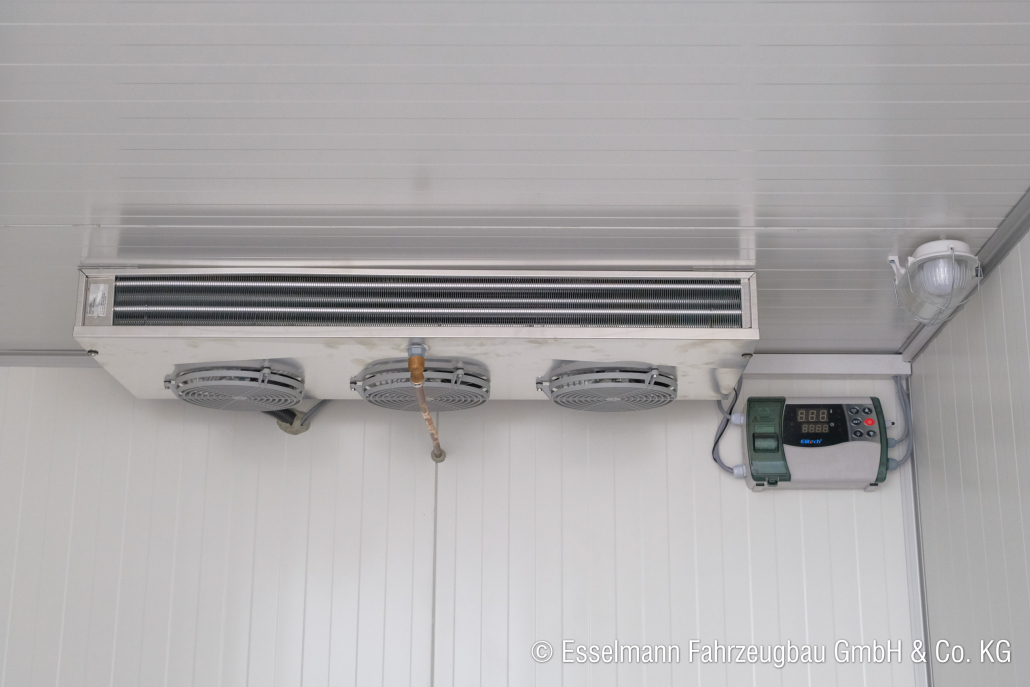Kälteanlage SplittChill© mit elektrischer Abtauung und elektronischer Regelung in einem Kühlmaschinenkasten an der Stirnwand oben montiert.